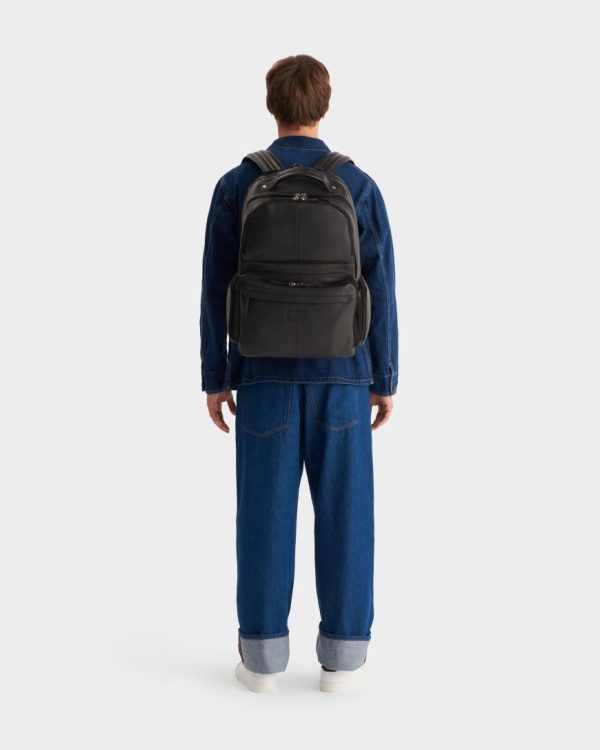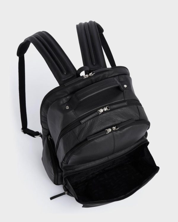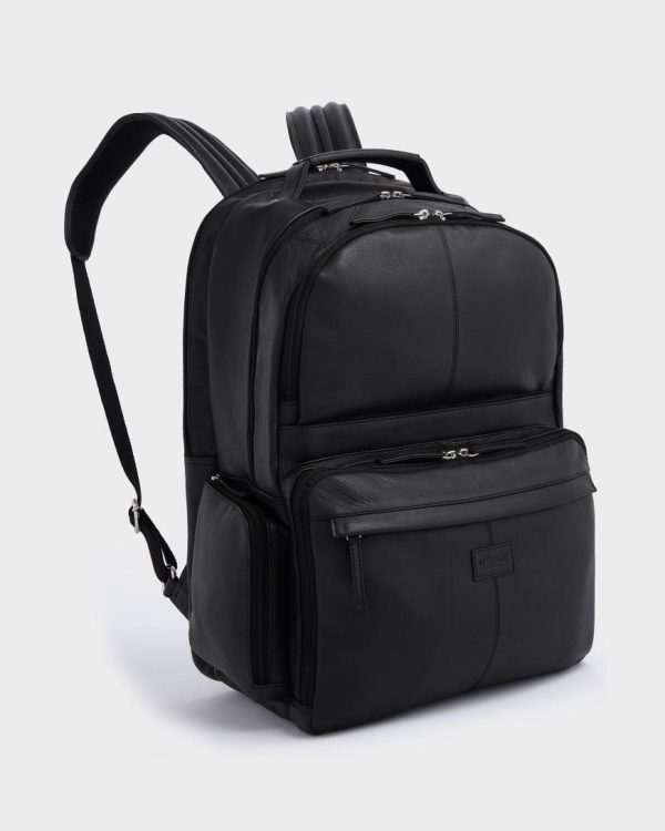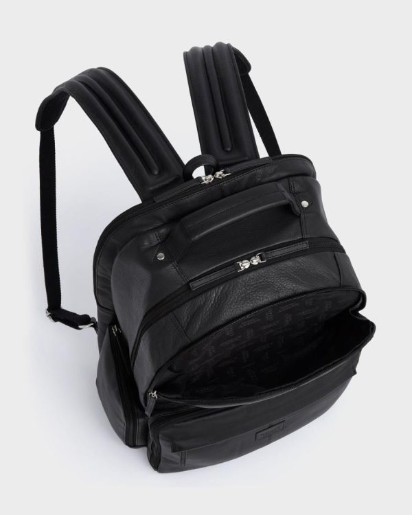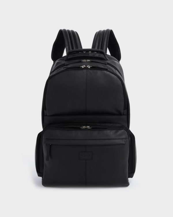 Meet The Lockton, a supersized, ultra-organised bag perfect for the modern business traveller. Crafted in supple black leather for a polished look, it features padded, adjustable wide leather straps and a breathable, padded back for comfort. All five A4-compatible compartments offer double zip entry, with slim sections for documents and wider ones for clothes and shoes. The final compartment includes a tech sleeve that fits up to an 18” screen. Finished with a padded leather top handle for easy carrying.