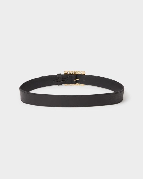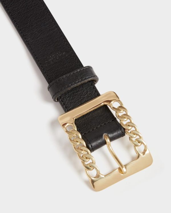 Crafted from premium Grainy Hide leather, the Chain Buckle Belt is a statement piece that features a gold chain link metal trim. A stylish accessory that adds a touch of personality and flair to any look. Its high-quality leather ensures long-lasting durability and adds a touch of sophisticated luxury to your wardrobe.