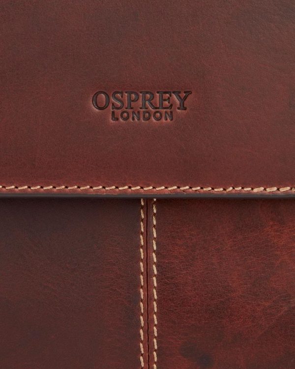 —Panelled front design with foldover flap, embossed with OSPREY LONDON logo.