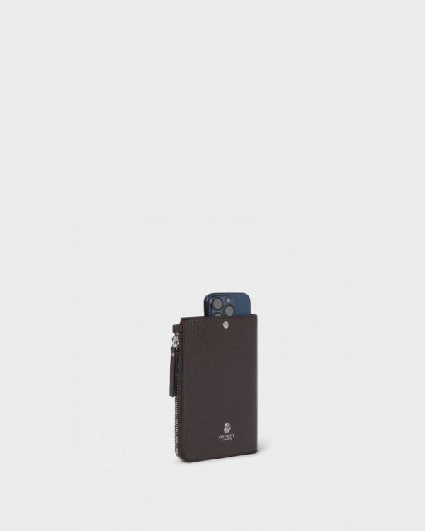 —The front compartment closes with a leather tab with a silver metal popper. Use it to safely carry a mobile phone including up to an iPhone 14 Pro Max.