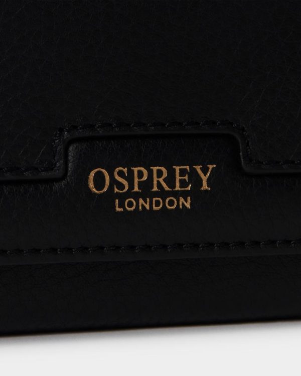 —The front flap features a leather keyline panel design, and it is embossed in gold with the OSPREY LONDON logo.