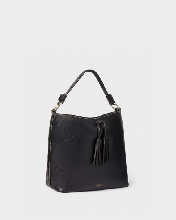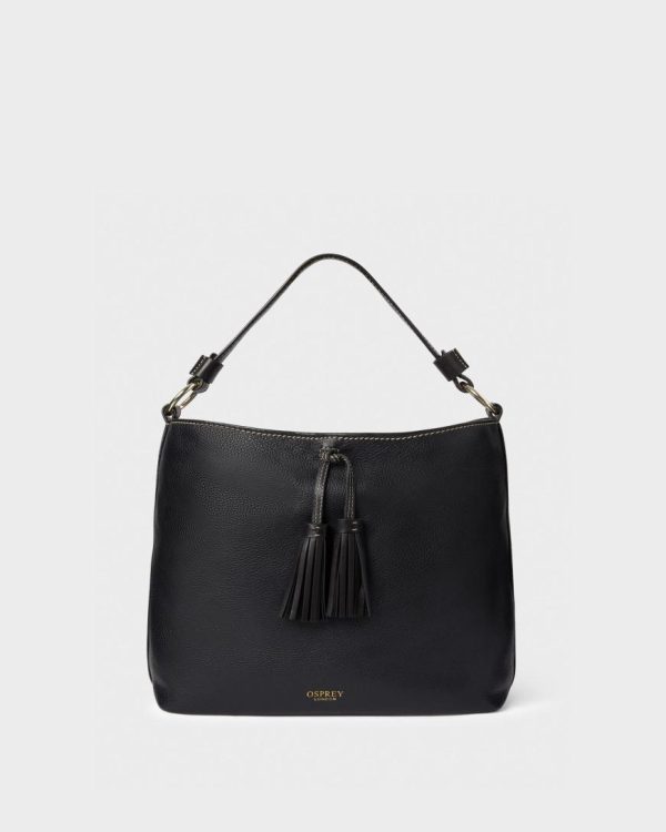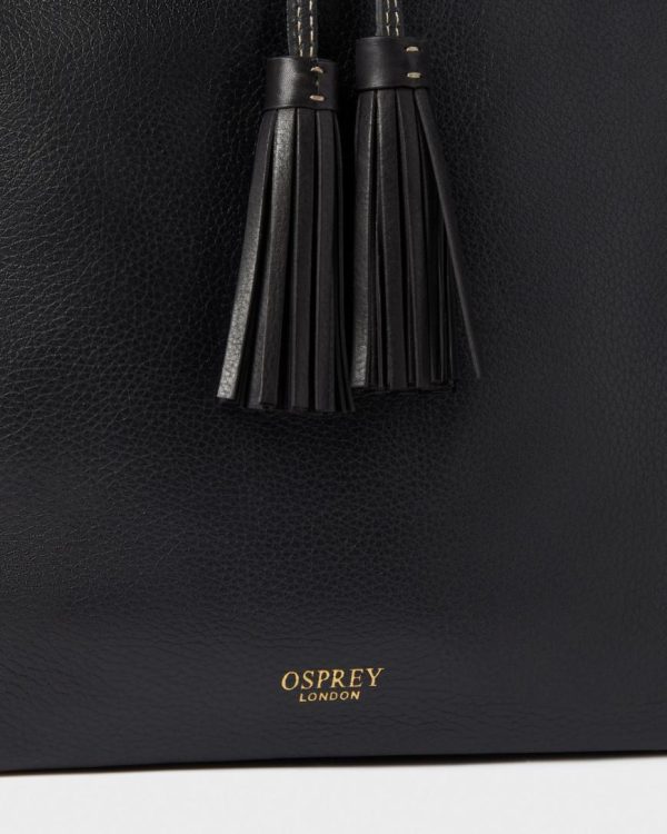 —The front of the bag features a statement sized pair of leather tassels and it bears the gold embossed OSPREY LONDON logo towards the base.