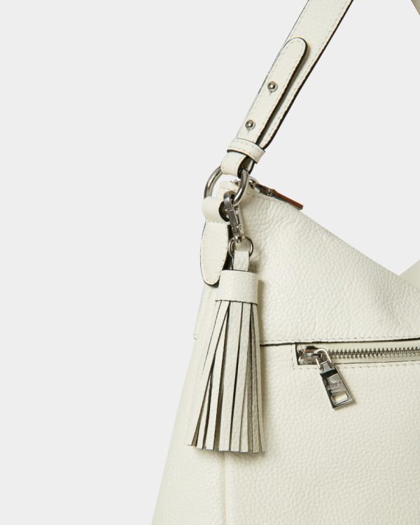 —A fixed, flat leather shoulder strap attaches to the bag at two silver circular rings. Adjust the length by moving the silver metal studs.