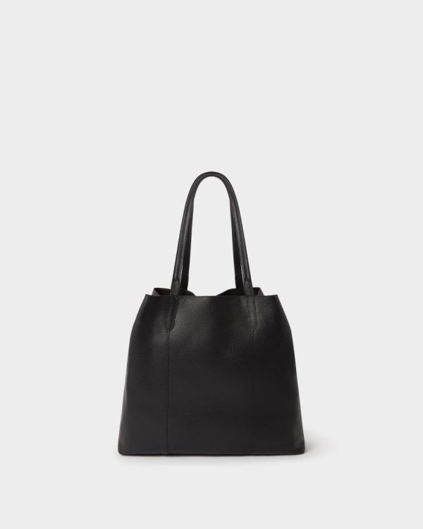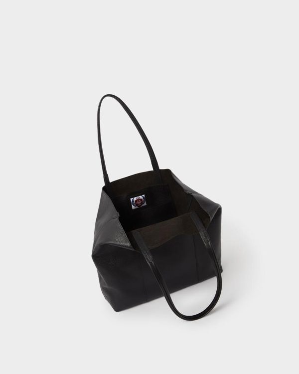 —Open top design for easy access, featuring two leather poppered tabs that, when fastened, pull together the sides of the bag, creating a more rounded bucket like silhouette.