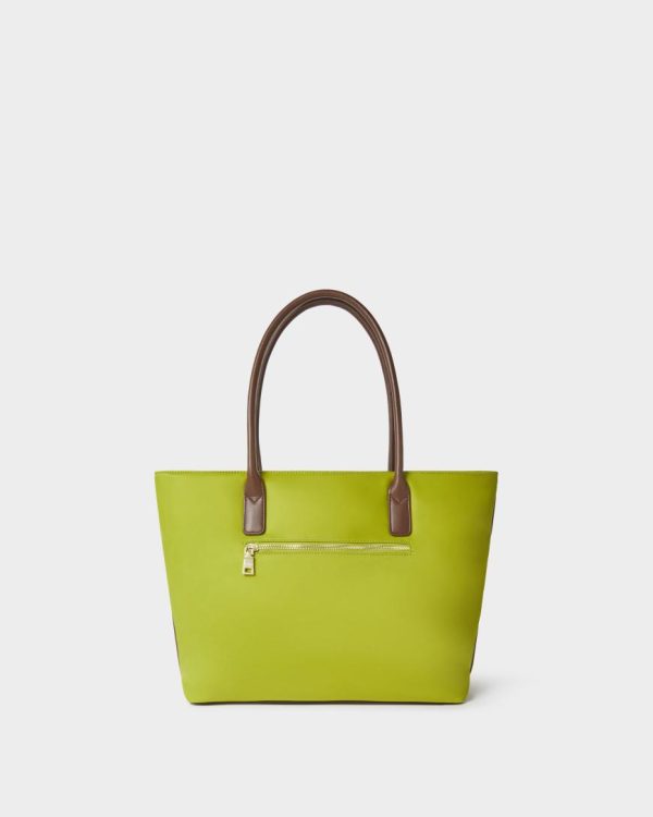 —Features two long flat handles in black Faux leather with running stitch detail: carry over the shoulder or in the hand.